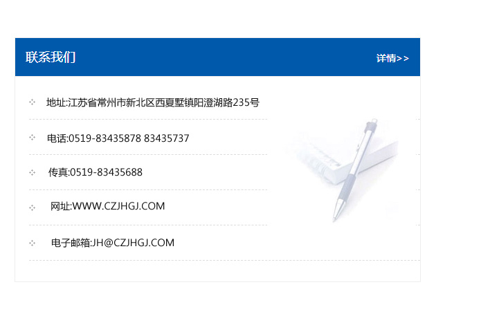 地址:常州市新北區友邦商務大廈1幢16、17層  電話:0519-85101652  傳真:0519-85112595  郵編:213022  網址:www_cz-jiayue_cn.taoomg.com  郵箱:xiajifengaa@163.com